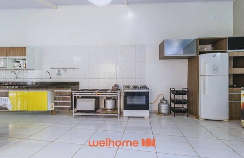 A cozinha é totalmente equipada com fogão, geladeira, freezer, forno, micro-ondas, airfryer, liquidificador, louças, talheres, utensílios de churrasco e mesa com 8 lugares, ideal para preparar e compartilhar refeições em família.