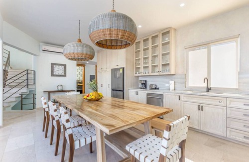 Fully stocked kitchen offers marble counters and stainless steel appliances, including dishwasher, any tools and gadgets that could possibly be needed for cooking. Or... bring in a local chef to do the cooking for you! The dining table seats 10-12 people and also can enjoy the terrace to enjoy meals. The master suite is furnished with a king size bed, closet, full bathroom ensuite. Step out from this bedroom to enjoy the terrace area. Second and third bedroom each have queen beds and share a full bathroom. Enjoy the tranquility of the fountain and lazy river from all bedrooms. The living area has a large Smart television (with international channels). Pocket doors allow an open space between kitchen, living area and outdoor terrace. In the evenings, relax in the jacuzzi and by the fireplace. The upstairs terrace has an ocean view, BBQ, outdoor bar and outdoor couches.