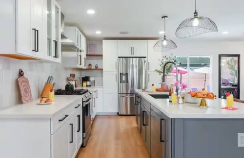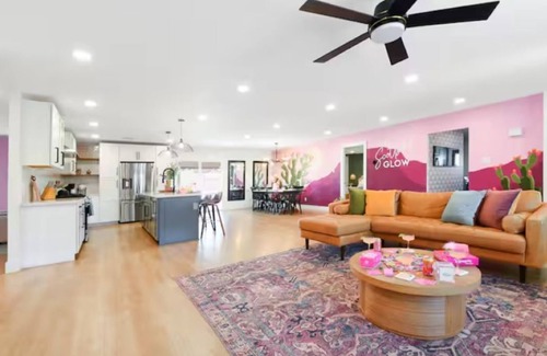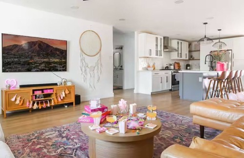 At Casa Nopal, you'll find a myriad of amenities tailored to enhance your wedding experience. The spacious interior boasts four beautifully appointed bedrooms, two bathrooms, and an open-concept living area that encourages togetherness. Get ready for your big day at the custom beauty bar equipped with ring lights, ensuring you look and feel your best. Step outside to discover a remarkable backyard, complete with a large heated pool (available upon request), outdoor dining areas, yard games, and a relaxing covered patio with TV for downtime between events. All the essentials are here for a seamless wedding getaway.