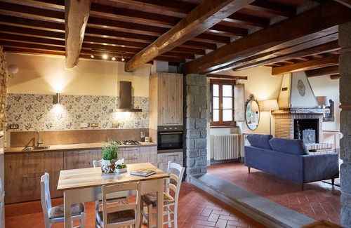 It develops on the first and second floor of an ancient Tuscan farmhouse. On the first floor there are spacious and comfortable spaces, a living room with a stone fireplace and a dining room, a kitchenette and a second bright living room, a single bedroom with a bathroom. On the second floor there are four double bedrooms and two bathrooms. A characteristic loggia offers the possibility of eating outdoors.