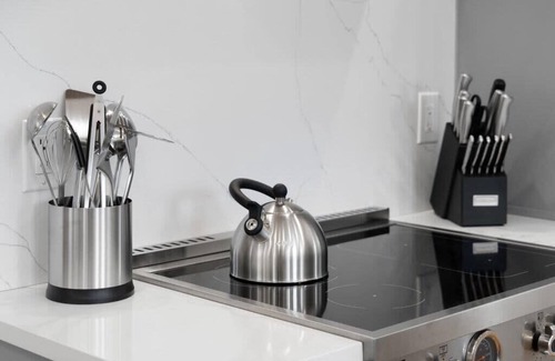 The open concept living space has plenty of seating, a Smart HD TV and access to the private outdoor dining area. The spacious kitchen is equipped with brand new Bertazzoni appliances as well as cookware and dishware for use throughout your stay. We provide a Keurig coffee machine fully stocked with coffee, creamer and sweeteners so your morning brew is on us!