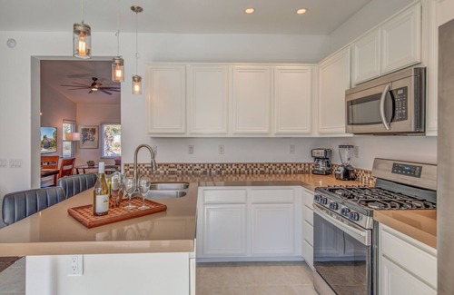 This designer chic vacation home has a great vibe. The focus is on easy, livable comfort. Bright light and a 1,400 square foot floor plan with glass doors that blur the lines between indoor & outdoor living. The living room, dining area, and kitchen are all open to each other. Enjoy plenty of space for your entire group to relax and kickback. CASA PALMA is newly remodeled, and everything has been updated for the way we live today - including new bathrooms, new kitchen, upgraded heating and cooling systems, high speed internet, 2 flat screen Smart TVs, and a gas fireplace. The new kitchen is outfitted with stainless appliances. The dining area has seating for 6 and flows into the living room.