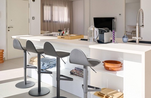 - open kitchen with induction cooker, electric oven, microwave, dishwasher, refrigerator-freezer, coffee machine, toaster and juicer
