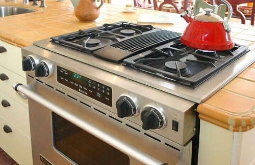 The professional kitchen looks beyond the dining room to spectacular views of the mouth of the Russian River as it meets the sea. The kitchen has all new appliances: large gas stove, family-size refrigerator, two stainless prep sinks, microwave, toaster, blender, coffee maker, and gourmet cooking supplies. We suggest dinner on the patio for evening gatherings or on the expansive deck overlooking the dramatic river and ocean views.