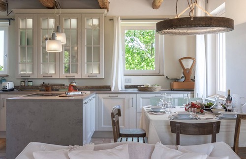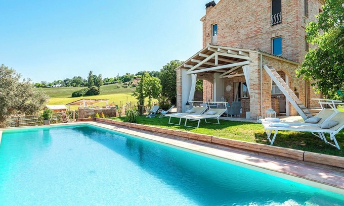 From a humble farmhouse to a prestigious country house destined for unforgettable stays, Casa Pilar arises from the remains of a typical farmhouse of the Marche countryside that had been abandoned and reduced to decay. The name itself, "Pilar", was inspired by the female character of the famous novel by Hemingway, "For Whom the Bell Tolls". Just as Pilar, a strong woman and consoling mother, forgets the pain of the past by inviting one to new life, so this house, which bears her name, wants to give new life to the old farmhouse and offer a holiday in the name of a renewed authenticity. The new house has been completely rebuilt following the most modern anti-seismic guidelines and in full respect of the wonderful country in which it lies. Every brick, every tile, every piece of furniture has been salvaged, restored and completely reintegrated into the new structure, which thus maintains the authentic characteristics of the previous one. Everything has been designed to have minimal environmental impact: a photovoltaic system supplies electricity to the house and a pergola is also equipped with photovoltaic panels, destined to the parking and charging of electric cars and e-bikes. The furnishing reflects the owners' passion for salvaging the old and giving it new life, with particular attention to elements of modern design perfectly balanced with the pieces of furniture salvaged from the old farmhouse.