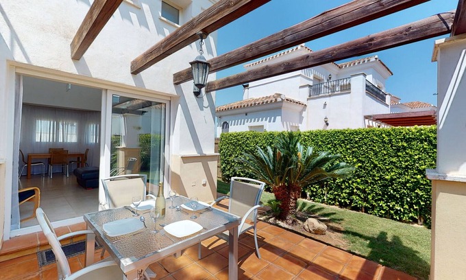 "Fantastic stay - Couldn't ask for better!" - Kathy JonesThis 2 bed, 2 bath detached villa was built in 2007 on the 5 star La Torre golf resort. In addition to a terrace and a large rooftop solarium to maximise time in the sun, the villa has a secluded rear lawn that is totally fenced or hedged in to ensure children remain secure (gates and fences were added to the front side in December 2014). Premium outside furniture including sun loungers and a table and chairs is provided."Relaxing Holiday in a beautiful Villa!" - Gunners60Inside Villa Quisqueya, all the accommodation (bar the roof top solarium, of course) is provided at ground floor level to the benefit of families and those with limited mobility. The main bedroom has a king bed (which can be de-coupled into 2 single beds) with fitted wardrobes and an en-suite shower room (shower, wc, basin/vanity, bidet and heated towel rail).The second bedroom is a twin room, again with fitted wardrobes. The large family bathroom is right next door, with a shower over the bath, shower screen, wc, bidet, storage unit and heated towel rail.(Note: Bedding is provided for all options: 4 single beds, 2 King sized beds or a combination of the two)"A lovely villa, which is as it is described in the advert and shown in the pictures." - PontefractIn the lounge you will find a double height room providing impressive space whilst high quality furnishings include a large L-shaped leather sofa, an armchair, coffee table and reading lamps. A 32' LCD 'Smart' TV with cable service provides >30 English language channels and a large selection of other language channels. A DVD player and a CD player are also provided. The oak dining table has an extending leaf and can comfortably seat 4 or 6.High speed Wi-Fi is provided in the villa free of charge.Air conditioning is fitted the lounge/dining area whilst central heating is provided for the cooler months of the year.The kitchen is fully equipped with oven, hob, fridge-freezer, dishwasher, microwave, coffee maker, toaster and a wide range of good quality crockery, cutlery, glasses, pots and pans. We stay at the villa out of season ourselves and have added the additional equipment needed to vacation very comfortably in the villa. You should find lots of extras that are often missing from self-catering accommodation. You'll also find a cool bag, a beach mat and folding chairs for your day at the beach.Next to the kitchen is the utility room containing the washing machine, iron, ironing board and clothes airers.Please note that bath towels, hand towels, tea towels and bed linen are provided. The closest of the resort's 22 pools is only 3 minutes gentle walk away and its low traffic private roads are ideal for families, cyclists or the elderly, as is the flat location and the secure gated access to the development. For shoppers, 3 major complexes are within 30 minutes of the villa by car, as are the historic city centres of both Cartagena and Murcia for those wanting to see the Spain beyond the beaches, mountains and golf courses.The villa is located in one of the sunniest and driest parts of Spain, virtually guaranteeing warmth and sunshine almost all year round. With Mar Menor and the Mediterranean less than 20 minutes drive away, the villa has the best of both worlds - a peaceful and quiet location combined with access to all the Costa Calida and the 3000 hours of sunshine it provides each year.A local English-speaking property manager is also available at the end of the phone to help you have a worry-free stay.Our guests staying at La Torre also have the added benefit of our fully staffed office at the resort, where you can get assistance, advice and recommendations, as well as help with any aspect of your travel or accommodations. Our staff speak Spanish, English, French and Arabic.