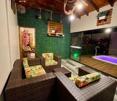 This property offers a private pool, free Wifi, and free private parking. The accommodation provides private check-in and check-out and a shared lounge for guests. Providing a balcony and pool views, the vacation home includes 1 bedroom, a living room, satellite flat-screen TV, an equipped kitchen, and 1 bathroom with a walk-in shower. Towels and bed linen are provided in the vacation home. The property has an outdoor dining area. You can play billiards at Casa Rústica com piscina. An indoor play area is also available at the vacation home, while guests can also relax in the garden. Adalberto Mendes da Silva Airport is 11 miles away.