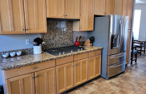 KITCHEN: Generous kitchen with all granite counter tops and lots of cupboard space, fully equipped with dishes, pots, pans, baking pans, crock pot, toaster, and blender. New gas cooktop and stainless-steel dishwasher, newer stainless-steel refrigerator. Kitchen table with seating for 4 additional people. Total seating inside is 15.