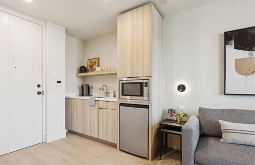 - Kitchenette: Nespresso Vertuo, mini-fridge with freezer, Panasonic microwave with air-fryer, plates and utensils, no stove