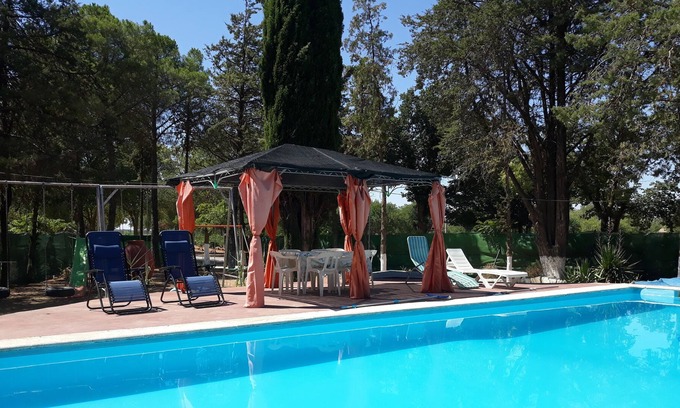 It has capacity for 8 people. It has 5 bedrooms, three bathrooms, living room with fireplace, kitchen, pantry, porch with barbecue, garage and swimming pool.