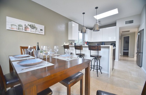 Dine at the dining table which has seating for 6 or use one of the barstools and carry on a conversation with your group.