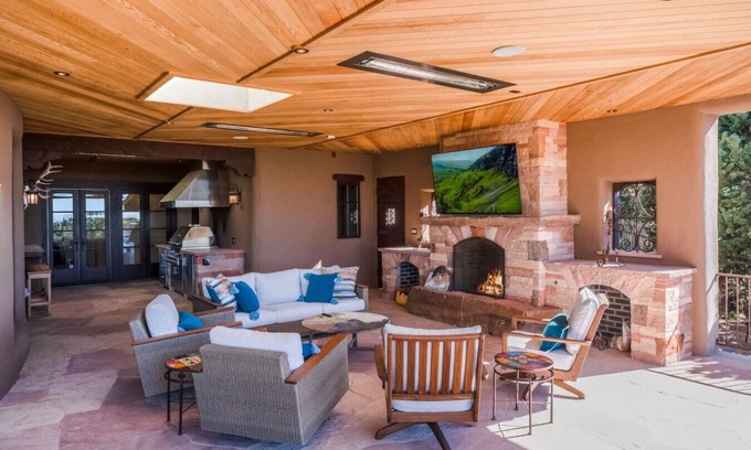 Casita: The private one bedroom, one bath casita above the garage has a separate entry and deck area. The cozy kitchen and the tv and fireplace in the living area, as well as the never-ending views will ensure a memorable retreat.