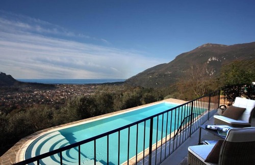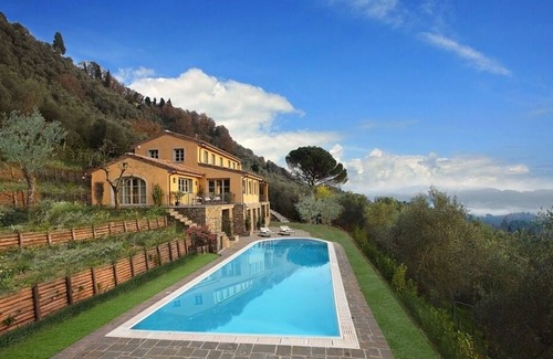 'Casa Tua', This recently renovated 300 square meter country house is in a wonderful location in the hills of Camaiore. Each of the rooms has spectacular views of the valley and the sea . On the ground floor, there are three bedrooms with en suite bathrooms. The ground floor has access to the garden and the pool area. On the first floor you will find a huge living area with two fireplaces, a large dining room, a professionally equipped kitchen connected to a covered pergola for outside eating and a wood and gas grill system. The master bedroom with master bathroom are located on the second floor . The master bathroom is also equipped with a home gym equipment by Technogym, professional Spazio Forma treadmill, and the Kinesis Personal Vision equipment for improving the basic skills of resistance, balance, strength, and flexibility. Flat Tv with Satellite, wireless adsl connection in all rooms. A beautiful garden and two acres of olive trees belonging to the property surround the villa. The pool size, 16 meters x 5 meters allows you to exercise and swim. The property is gated and alarmed. Because the Villa is built on three floors and has many stairs, as well as a pool with a depth ranging from120/180, we do not recommend for children from 12 to 48 months. The property is 1 mile away from the Camaiore village center and five miles from the seaside. Casa Tua is a beautiful villa located on the top of a hill with an impressive view of the valley and of the sea. The street to reach Casa Tua gets narrower in the last half a mile, with a couple of curves where if you have a big car you should do some steering manoeuvers. While all kind of cars could reach the villa, we suggest, if you want an easier and handier driving, to rent mid size cars.