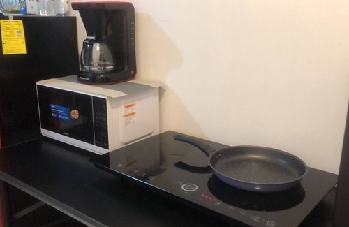 A living room and a sofa bed are featured at this 2-bedroom, 1-bathroom rental. Bathroom amenities include towels, soap, and shampoo. The kitchen is equipped with a stovetop and a refrigerator, as well as a coffee maker, an electric kettle, and a microwave.