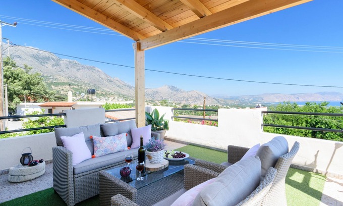 Located at the most central point of the village of Kastellos offers panoramic mountain and sea view. From the 1st floor veranda the view of the endless blue of the sea of Georgioupolis and Kavros , as well as the Cretan mountains that rise into the blue sky, make up an enchanting scenery.