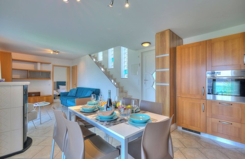 Step inside and to your left, discover a fully equipped open-plan kitchen with direct access to a romantic terrace for two, where you can sip your morning coffee while overlooking the lake. The adjacent living room is designed for relaxation, featuring a cosy sofa and a spacious dining table for memorable family meals.