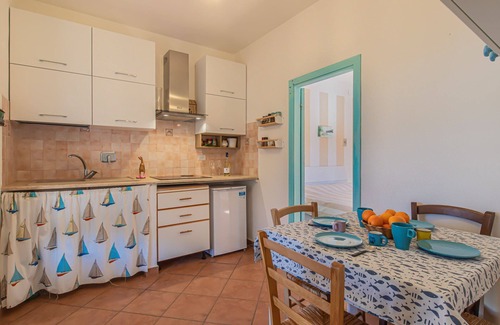 Casa Zullo is a charming two-room apartment featuring a small living room with a kitchen and dining table at the entrance, a bathroom, and a bedroom with a double bed, a bunk bed, and a third pull-out single bed.