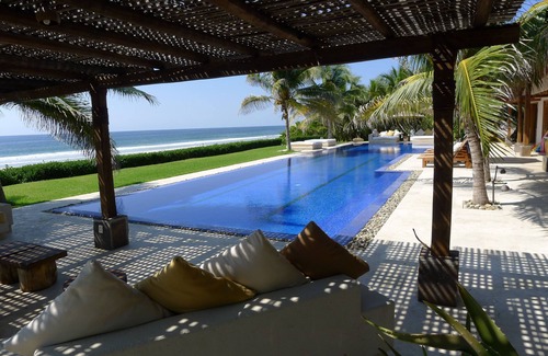A unique luxury oceanfront estate in the middle of a pacific paradise. 20km natural white sand beach only for you. The house was completed in 2014 and permanently maintained. We just changed all mattresses, bathroom equipment, the entire Palapa roof. We have perfect water quality from a deep well. The house has a huge master and 5 luxury guest rooms with 2 king size beds (2.4 meter x 1.8 meter each), an additional TV-room and three separated houses for the service area. The big master bedroom has 200sqmeter with an ocean view terrace. The estate is built in a mexican style with german quality and has a fantastic cool and fresh palapa roof surrounded by a large green garden with lakes. All bedrooms with A / C. Big living room connected to the terrace and the 25m x 7m competition overflow pool with two lanes. The dining room is for up to 14 persons as well connected to the terrace. Total living area is 1500sqmeter ( 16000sqfeet ). The property has a staff of 7-9 people. housekeeper, chef, gardener, service, poolman and watchman. The house is 12km outside of the famous surfing paradise of Puerto Escondido direction to Mazunte and Huatulco (south-east). This is the best place for an individual holiday to relax, to do sport, to meet mexican culture and people to enjoy best food and everything else what you always missed in the past. You will see whales, delphins, seaturtles and jumping mantarays directly in front of the villa. To protect nature and environment only some private villas are build here. Hotels and resorts are not allowed to build. The tranquility all around is fantastic. The famous culture city of Oaxaca is very close ( 160km ) and to reach with a little plane from Puerto Escondido in 35min and in 2024 at the new highway in 2h.