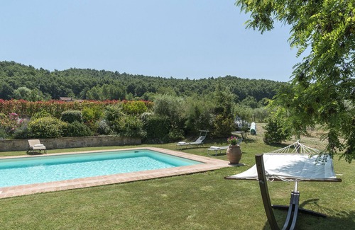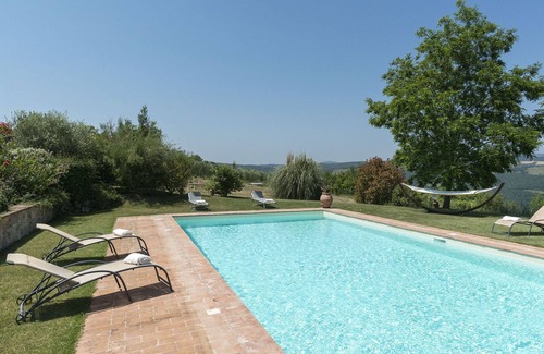The panoramic pool is located at a slightly lower level than the house, about 15 m away, and is reached across a stretch of lawn or down a few steps. The rectangular pool with four large Roman steps measures 12 x 6 m with a constant depth of 1.50 m. It has chlorine purification, PVC lining, internal lights and a thermal cover for the night. The terracotta-paved sunbathing area around the pool is surrounded by a spacious lawn provided with sunbeds, swing and gazebo that provides shade during the hottest part of the day and is furnished with a small table and sofa. The pool is open from the last Saturday in April until the first Saturday in October.