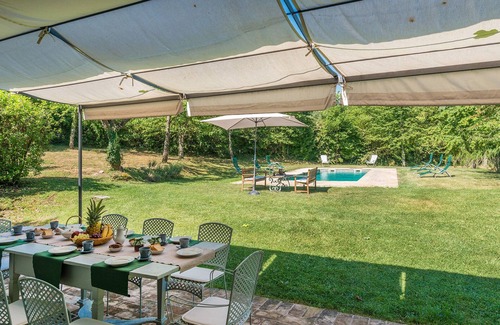 The pool is sited in the centre of the beautiful garden in front of the house, which is just a few metres away and can be reached across the lawn. The rectangular pool, with a ladder for access to the water, measures 9 x 3.5 m with a depth varying from 1.20 m to 1.80 m. It is lined in shimmering sky-blue concrete and has biowater salt purification. Around the pool is the solarium area, paved in terracotta along the border, with a large area of lawn protected by thick vegetation on one side and bordered by cherry trees and rosemary bushes on the other two sides, and equipped with deckchairs, umbrella and table with benches. It is open from the last Saturday in April to the first Saturday of October.