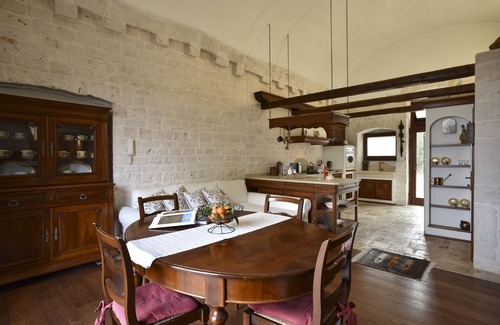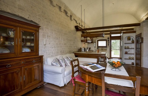 It is located in the heart of Apulian countryside, exactly in the countryside of Castellana Grotte. The villa keeps a refined but simple style, typical of private Apulian historical houses. Everything reminds the uniqueness of Apulian land, from the floors to the walls in lime, from interior to exterior furnishings and evokes the charme that only a building dating back to 200 years ago can arouses.