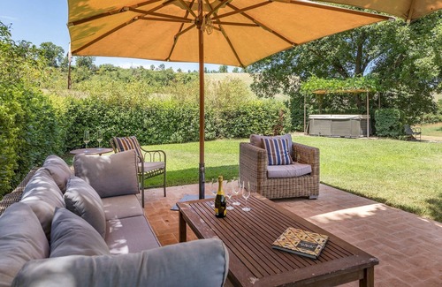 Casale Piattini is located within a 300-hectare farm estate. The unfenced park belonging to the house consists of about 5 hectares of woods and fields. The well-kept garden surrounding the house and pool has a lawn with many varieties of rose bushes, wisteria, jasmine, rosemary, lavender, laurel and centuries-old oaks that ensure large areas of natural shade. Near the kitchen is a jasmine-covered pergola equipped with two tables, benches and a barbecue where guests can dine outdoors while enjoying a relaxing view of the hilly countryside opposite. Outside the sitting room are two vine-covered pergolas with small table, chairs and benches. Before descending to the pool you come to an outdoor seating area with armchairs, sofa, umbrellas and hammock. Under the shade of a large oak is the 3-car parking area.