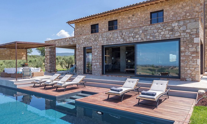 Casale The Place is a recently built stone villa immersed in the Umbrian countryside, near Todi, surrounded by olive groves, vineyards and sunflower fields. Completed in 2023, the house was designed with a clean, industrial-chic style, characterized by oak, concrete floors, beamed ceilings and carefully selected contemporary furnishings. Large windows and sliding French doors directly connect the living area to the garden and pool, creating a perfect dialogue between indoor and outdoor spaces. The villa, on three floors, has four double bedrooms with private bathrooms and a panoramic porch with pergola ideal for outdoor lunches or evening appetizers. The location is strategic for visiting some of the most beautiful cities in Umbria, such as Todi, Orvieto, Assisi and Perugia, all easily accessible by car.