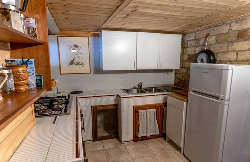 • Cozy living room, with a wood-burning stove, wooden ceilings, and stone walls, creating a warm and romantic atmosphere, ideal for evenings with friends and family.