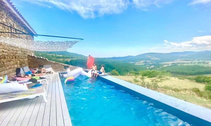 Les Bernards is a stone farmhouse originally built in the 1800s. It was completely renovated in 2015 with modern amenities, 5 bedrooms and 3 full bathrooms. It's an ideal holiday home of 260m2 for large families and groups of friends up to 12 people plus an infant with a high chair and travel cot at your disposal . A real home-away-from-home, nestled in the mountains of Ardèche with stunning views, Les Bernards features gardens with an outdoor dining area, BBQ & Pizza oven, terrace, infinity pool, Swedish bath, a 150m2 barn housing a trampoline and ping pong table, billiards, foosball, Bocce pétanque. Inside the home, there is a double-sided fireplace, 2 living rooms, a full kitchen with island, a farmhouse dining table.