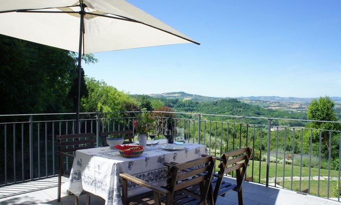 From the large swimming pool, which is surrounded by beautiful nature, you have an excellent view over the green rolling hills of Le Marche and the castle of Gradara.
