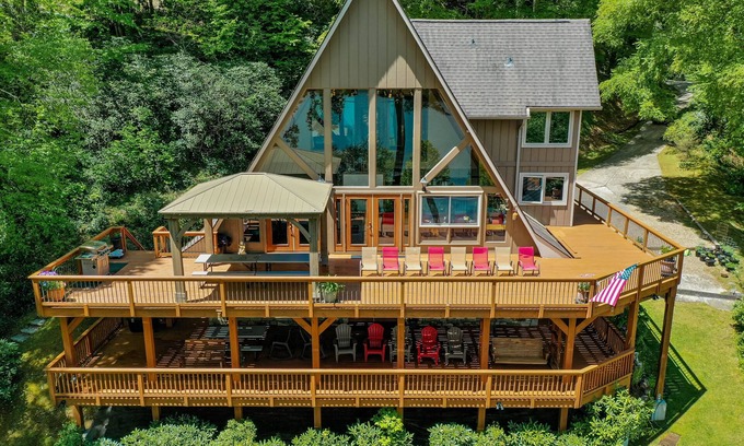 Reflect on mother nature's serene beauty from 'Gratitude Retreat,' a 5-bedroom, 3-bath vacation rental home in Cullowhee on Lake Glenville. Perfect for a family retreat, this home sleeps up to 14 and features 2 viewing decks, a furnished pergola and private dock. Explore the lake up close when you take out the provided canoe..