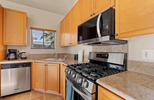 The home’s bright and modern interior has everything you need to maximize your downtime, complete with contemporary furnishings and sophisticated décor. Sink back into plush sofa seating while you sip on your morning coffee or break out that new book you’ve been saving, the fireplace providing a cozy ambiance in the cooler months. The fully equipped kitchen offers stainless steel appliances, glossy stone counters, and warm wood cabinetry for storing all your snacks alongside provided cookware and dining ware. Enjoy meals both large and light seated on high-top stools at the island, or head out to the breezy back patio for an al fresco dining experience in the fresh desert air.