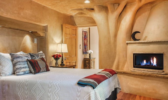 The bedroom has a queen bed that looks onto a gas fireplace embedded within the diamond plaster tree that gives the home its name.