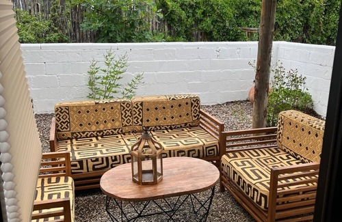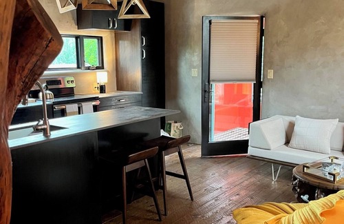 The modern chic organic decor of this casita, inspired by Northern African and Santa Fe architecture creates a sense of relaxation and an intimate connection to the environment.