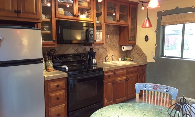 Casita Kino is an intimate and absoluteley charming Mexican-style studio guesthouse featuring a newly remodeled kitchen and bath, private entrance, parking, secluded location with its own patio adjoining a lush and beautifully landscaped oasis yard. Impeccably clean, fully furnished, and equipped for a relaxing and comfortable stay.