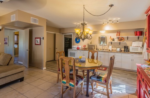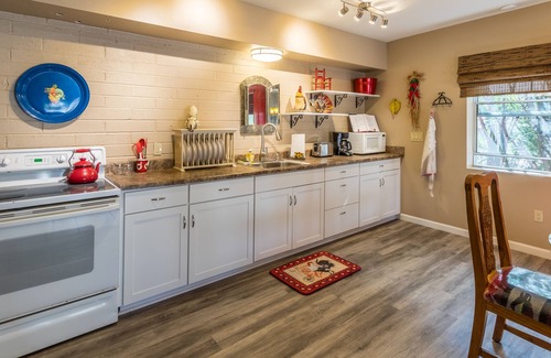 ENJOY THE CUTEST KITCHEN EVER! FULLY EQUIPPED WITH ALL YOU NEED INCLUDING LOVELY SOUTHWEST INDIAN DESIGN SILVERWARE AND DINNER WARE. DINING AREA WITH SEATING FOR 4. APPLIANCES INCLUDE STOVE AND OVEN, MICROWAVE, REFRIGERATOR WITH ICE MAKER. FULL SIZE WASHER AND DRYER IN AN ENCLOSED ROOM OFF KITCHEN. NEW MATTRESS WITH TOTAL MATTRESS COVER. NO REFRIGERATED AIR CONDITIONING. EVAPORATIVE COOLING AND BASEBOARD HEATING. SPACIOUS PARKING AVAILABLE.