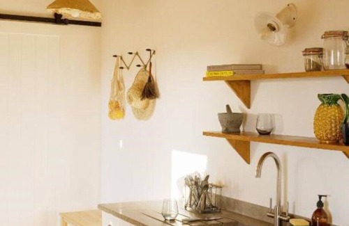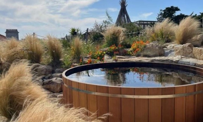The property features include a sunset terrace, hot tub, free private parking, 1 master bedroom, a living room, a fully equipped kitchen with a fridge and a coffee machine, and 1 bathroom with a shower and a large bath tub. You will also have access to our outdoor conservatory dining space, children's play area, teepee, and herb gardens.