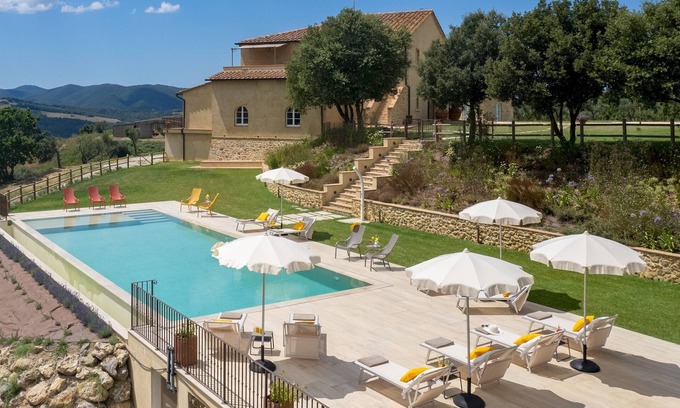 Casolare San Martino is a renovated Tuscan farmhouse located on the hills near Pomarance, with panoramic views of the Val di Cecina. Ideal for large families or groups of friends, the property is divided into four independent apartments (in the full version), surrounded by a garden with lawn and furnished terraces for outdoor dining and moments of relaxation. An infinity pool with loungers is located on a lower level of the garden, with open views of the countryside. The interiors, spacious and decorated in a contemporary style, preserve rustic elements such as exposed wooden beams and stone walls. Just 2 km from the center of Pomarance, the villa is well placed for exploring Volterra, the geothermal valley of Larderello and the trails of the Berignone nature reserve. The owners' residence is located next to the villa, separated by a hedge, and is not used daily.