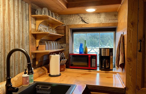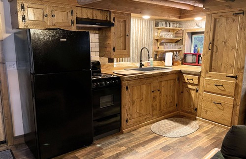 The kitchen is well stocked with an assembly of cooking needs including a microwave and coffee maker. The back door leads out to the new covered porch that overlooks the homesteads old apple orchard. You will find a new gas barbecue, a large picnic table perfect for family gatherings, and a couple of Adirondack chairs for relaxing and taking in the scenery of the property and the surrounding mountains. A rock built fire pit sits out front of the cabin for those nightly gatherings of roasting marshmallows and making s’mores.