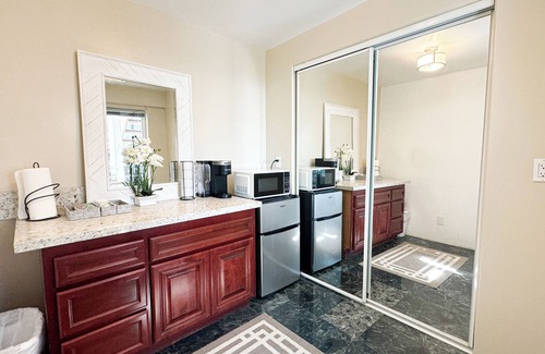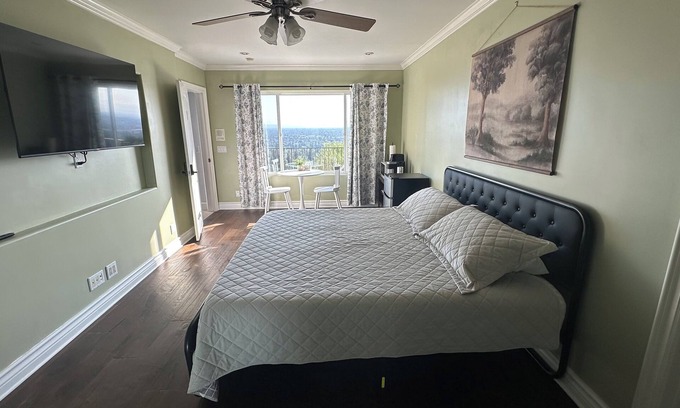 Experience panoramic views of LA! This retreat features two neighboring spacious suites, each with its own private bathroom for maximum comfort and privacy. Room 1 has a king bed and 60" TV. Room 2 has a jetted tub, queen bed, large sofa bed, and a 70" TV. Includes 2 designated parking spaces. Shared laundry room and backyard. Access to both rooms require walking downstairs. Perched on a hill, this combination of suites offers sweeping views of LA County and a peaceful setting to unwind. Enjoy incredible sky views and sunsets. Conveniently located near top LA County attractions, you’ll have easy access to dining, entertainment, and outdoor adventures while enjoying a serene retreat above it all. Please be mindful of other guests and our neighbors.