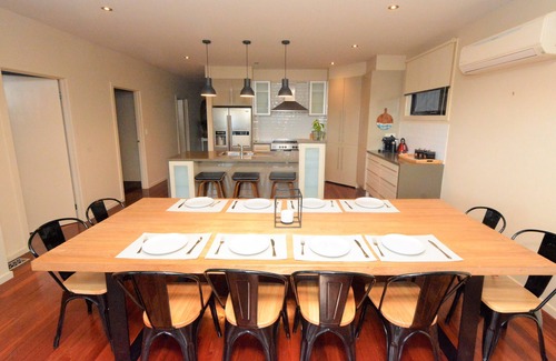 Modern coastal 4 BR home sprawling over two spacious levels, culminating in stunning ocean views of the Barwon River, The Bluff and the blue waters of Bass Strait. A fully equipped kitchen with quality appliances and 3 metre dining table that easily allows you to entertain up to 12 people.