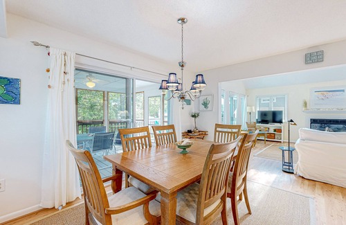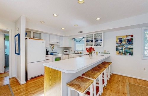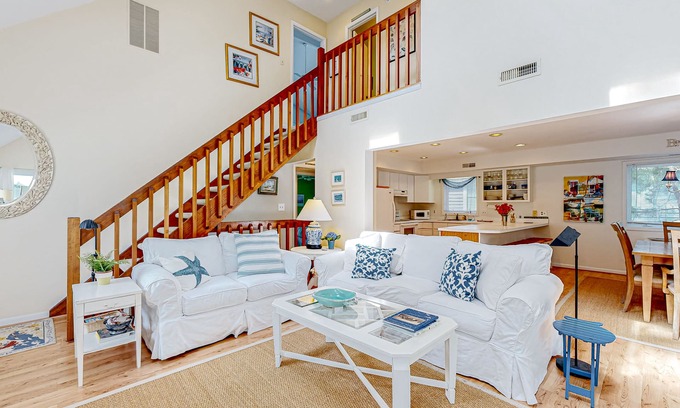 Upon entry, you'll be met with a bright interior and a beachy vibe throughout the well-appointed living area. Marvel at the high ceilings, nautical decor, and a blanket of natural light that radiates comfort from every corner. Relax and make yourself at home by resting on the plush furniture, streaming a movie marathon on the large TV, or serving brunch on the screened-in porch. Prepare grand meals and beach picnic snacks in the sophisticated kitchen, equipped with ample cupboard room, a breakfast bar, and a formal dining table. Comfortable beds in spacious bedrooms ensure everyone receives a wonderful night's rest from the day's adventures. A private washer/dryer is provided for the ultimate convenience.