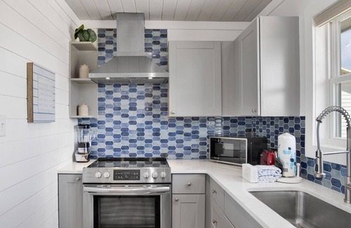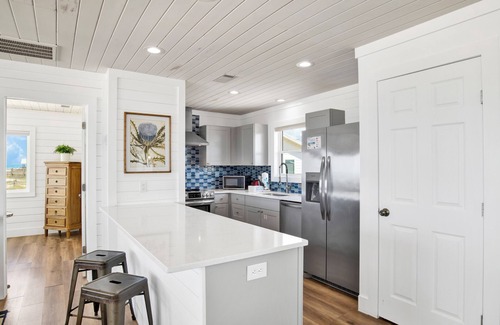 This beautifully renovated cottage comfortably sleeps up to eight people, featuring two spacious bedrooms each equipped with their own full bathrooms. The master suite offers captivating beachfront views and is complemented by a cozy second bedroom. An inviting living room with a sleeper sofa ensures everyone has ample space to unwind, while the well-appointed kitchen invites you to share meals and celebrate together. Enjoy the sunshine on the back deck or find solace in the shade on the covered front porch – perfect for a pre-wedding toast or an intimate gathering with loved ones. Plus, being a pet-friendly property allows you to include your furry companions in this joyous occasion (additional fees apply).