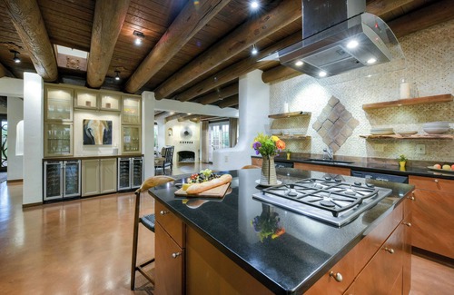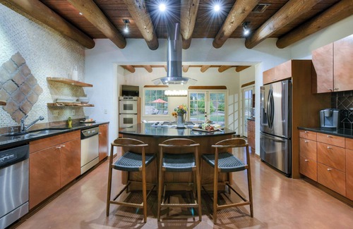 Hacienda Panorama is an idyllic retreat located in a quiet, established neighborhood close to Tucson's finest shopping and dining. This stunning, 4,000-square-foot, single-level, Santa Fe-style home, poised on over two acres, has a rustic yet modern aesthetic, with exposed wooden beams, kiva fireplaces, iron fixtures, beautiful art, and elegant living spaces throughout.
