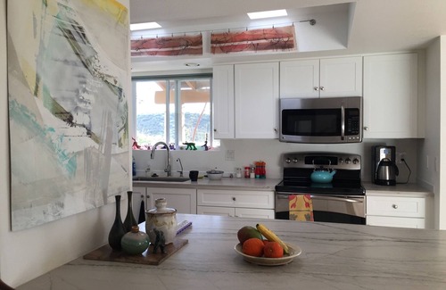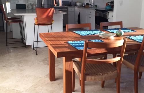 The open one level floor plan is light filled . There are seven skylights. The kitchen is fully equipped and has counter seating. Newer refrigerator/freezer and dishwasher. Water filter system at the sink. The teak dining table can seat six plus. The living room has new comfortable couches from Room and Board, and a new internet connected Sony 4K 54" flat screen TV.