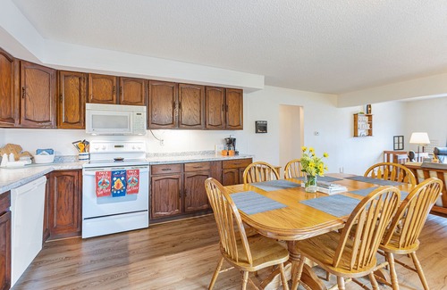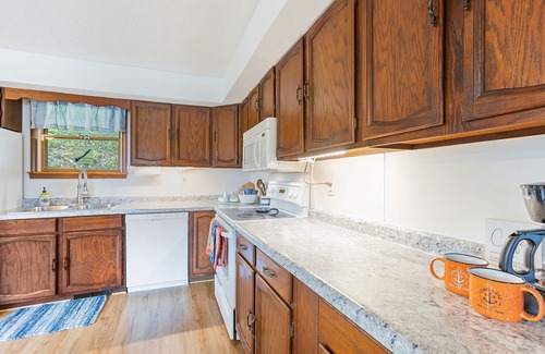Inside the kitchen is fully stocked with everything: dishes, pots/pans, small appliances, etc., and is a great space for gathering with friends and family. The spacious dining area has a nice sized table for meals or game night. The living room is large with lots of natural light and views of the lake, and a fireplace. The bathroom is roomy, with a full tub and lots of storage. The set up is similar to our other neighboring 2 bedroom cottages: 1 queen room, 1 twin/full bunkbed, and a futon in the living room. When it rains, no worries, we offer free wifi, a smart tv, smart dvd player, dvd's, and some games to entertain you and your guests.