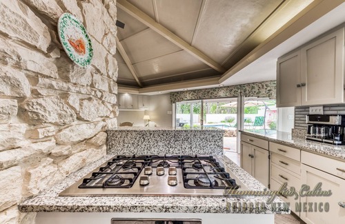 As you enter through the front gate, the open, wraparound patio welcomes you into a beautiful stone courtyard—your personal oasis. Relax in the abundant seating, surrounded by native New Mexico plants, or take a refreshing dip in the lap pool, featured in scenes from the movie. The courtyard, enclosed by a privacy fence, is perfect for morning swims or stargazing at night. And when it's time to eat, fire up the BBQ grill and enjoy a meal al fresco in this serene setting.