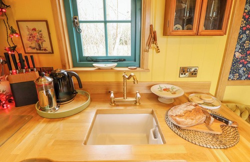 Catchwater, a single-storey shepherd's hut, consists of an open-plan living space with a breakfast bar seating two, woodburning stove, combi microwave/oven, two-ring electric hob, fridge/freezer, kettle, toaster, cafetière. The bedroom is a kingsize with Smart TV, serviced by a shower room with a walk-in shower, basin, heated towel rail, and WC. WiFi, fuel, power, starter pack for woodburning stove, bed linen, and towels are all included in the rent. Outside, there is a non-enclosed front garden with decking, chairs, stone standing for a barbecue/fire pit, and off-road parking for one car. One well-behaved pet is welcome. Sorry, no smoking. Guests can find a shop in 1.6 miles, and a pub in 1.8 miles. Your stay at Catchwater is sure to be a memorable one. Note: There is a Good Housekeeping Bond of 150GBP. Note: When booking this property, guests will automatically become a free member of Wanderlust Camping Club. You will be added to their mailing list and will occasionally receive updates. Marketing subscriptions can be managed directly with Wanderlust.