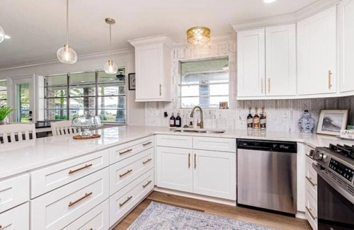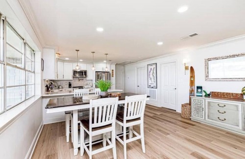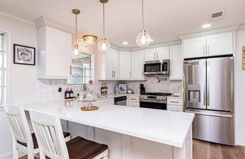The home features an updated kitchen with a marble backsplash, quartz countertops, a breakfast bar with seating, and a large dining table that comfortably accommodates 6 guests. This is the perfect area for groups or families to enjoy a feast or play a board game (board games provided).