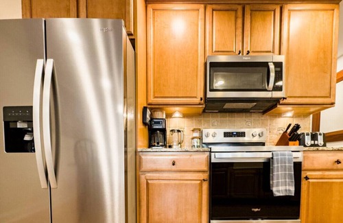 This condo is all about finding comfort and relaxation after a day of action and adventure. The living room features a wood-burning, stone fireplace and a full wall of windows and a sliding door overlooking birch trees, mountains and a pond. The back deck is the perfect spot to enjoy a warm drink or cocktail while watching the sunset and then gazing up at the stars by night.